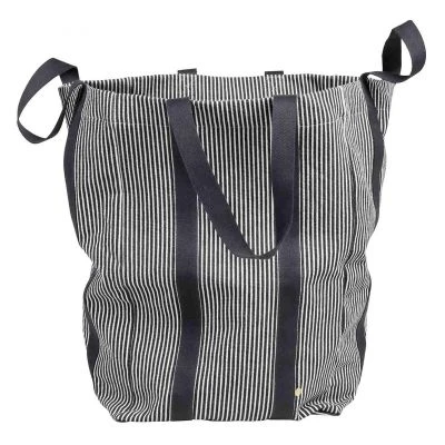 De gestreepte Maxi Poppins bag met zwarte banden van La cerise sur le gâteau is de grote broer van de boodschappentas. Deze kan in de hand of over de schouder worden gedragen, omdat de tas is voorzien van twee lange banden en twee kortere. Deze banden geven een leuke speelse touch aan de tas.