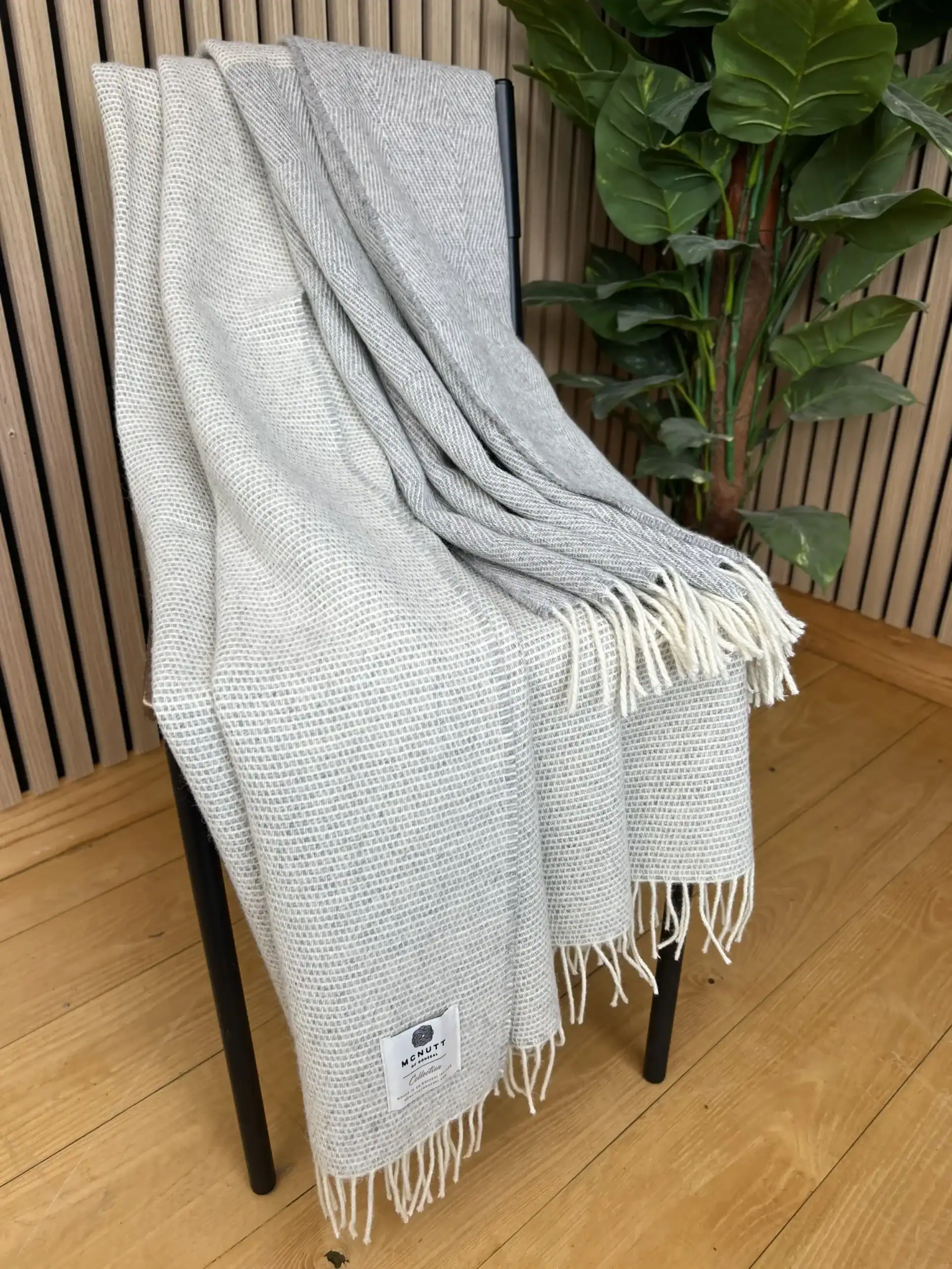 Heerlijk zacht, warm plaid van zware kwaliteit in een lichtgrijze kleur. Dit plaid van McNutt of Donegal is gemaakt van puur merinowol. Gebruikt de deken als prachtige accessoire of als omslagdeken voor de koude dagen.