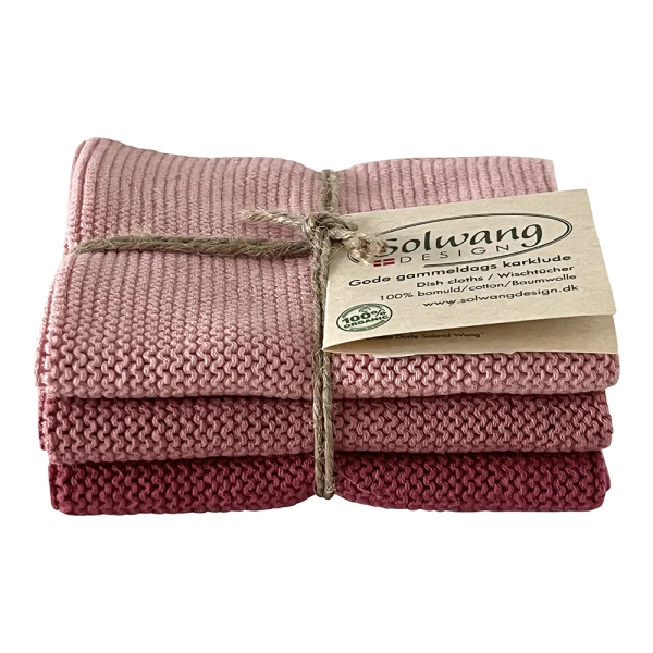 De Solwang Design vaatdoeken zijn zo gebreid dat ze een uitstekende absorptie hebben. De set bestaat uit 3 gebreide biologische vaatdoeken in 3 tinten roze. Prachtig vastgebonden met lint en merk.