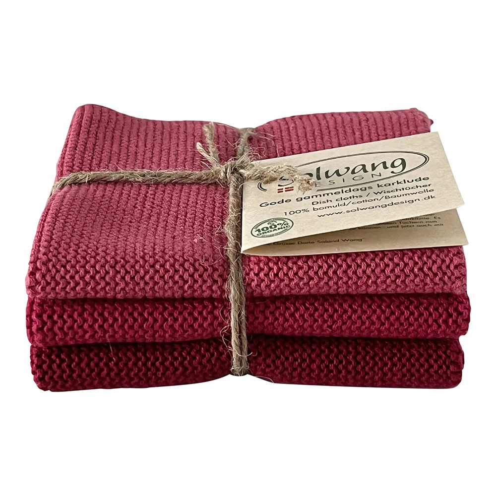 De Solwang Design vaatdoeken zijn zo gebreid dat ze een uitstekende absorptie hebben. De set bestaat uit 3 gebreide biologische vaatdoeken in 3 tinten rood/roze. Prachtig vastgebonden met lint en merk.